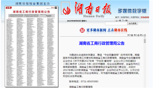 本报讯来自湖南日报多媒体数字报刊平台消息,湖南省工商局近日发出公告,为推进社会诚信体系建设,营造“守合同重信用”的市场环境,根据国家市场监管总局工作要求和湖南省工商行政管理局、湖南省守合同重信用企业协会《关于开展2017年度“守合同 重信用”企业公示工作的通知》(湘工商市字〔2018〕5号)的文件精神,经企业自愿申报,全省各市州工商局审核推荐,湖南省工商行政管理局征求省相关部门意见后,决定对2017年度包括“湖南湘联节能科技股份有限公司”在内的2220家湖南省“守合同重信用”企业向社会予以公示,其中长沙有861家企业上榜。